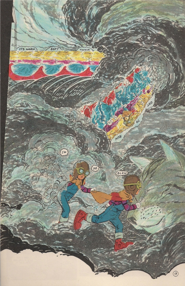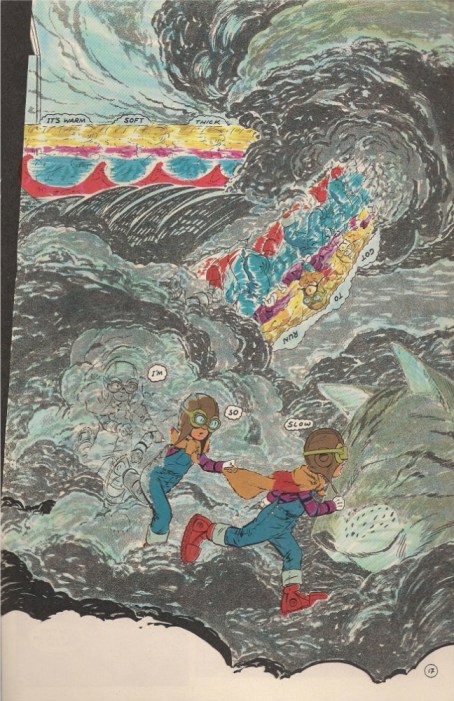 Above we see Marshall Rogers, among the ‘star’ superhero artists of the late ’70s/early ’80s, at his most transformed. This is from Cap’n Quick & A Foozle, his one and only longform project as a writer/artist, although Rogers actually took the credit of Director; this was, I suspect, partially in homage to the Warner Brothers cartoons that provided no small inspiration, but it also highlights Rogers’ understanding of himself at the head of a band of collaborators, including scenarist/colorist Chris Goldberg, and additional colorists René Reynolds & L.J. Chapin. As you might guess, there’s a lot of emphasis on color in this thing, ranging from odd, hazy translucent effects to washed-out blue & green over pencil shading, to – ah, see above. I don’t think Eclipse would publish anything quite so anxious and out-there again until Floyd Farland, Citizen of the Future.