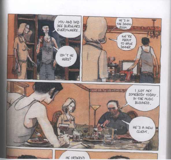 Yet before the second “song” ends, after such a beautiful quiet intro, the whole thing builds to a crescendo of power and pushes the narrative along in a new and innovative way. The sun goes down and during a lovely evening dusk, we’re introduced to the singer, Stefano, and his family. Seated at the dinner table is Stefano’s mother and father already eating when Stefano arrives home.  There is a nice formal set up of panels where father and son are often making the same expression while eating. Gruff, tough, the working-man father tells his musician son that he met somebody “in the music business” who agreed to listen to Stefano’s band. The son is equally impenetrable as the father and doesn’t ever look up from his plate while his dad relates the story of giving a discount at his business to the music A&R man if the man will listen to his son’s music. It’s a powerful sequence of clinking forks on plates and silent, visual punctuation that rings true and affords a perfect segue to the introduction of the bass player’s life and their evening ‘round the dinner table.