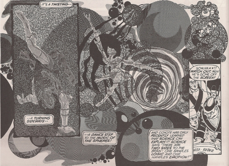 This is from Coyote, still the best F-bomb dropping, full frontal nudity superhero comic about the son of a were-beast and a psychic vampire foiling a gas mask & leather-clad interdimensional skeleton’s plot to undermine America’s morale by poisoning Hollywood stars with radioactive Oscars. The dance between perceptions is a decoration of movement, almost a fetishization, communicating in distinctly controlled circles & tones an ecstasy suddenly allowable away from the demands of corporate franchises.