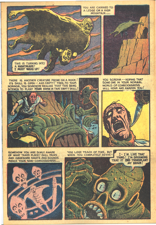 Last night, it was clear to me which book’s visual aesthetic was preferable, and the contest wasn’t even close. This morning, I am not quite so sure that the matter is a simple matter of right and wrong. But, using images from Basil Wolverton’s classic story “Nightmare World”, why don’t I let you decide? Which do you think is a better way to publish a comic story more than a half-century old? This?:
