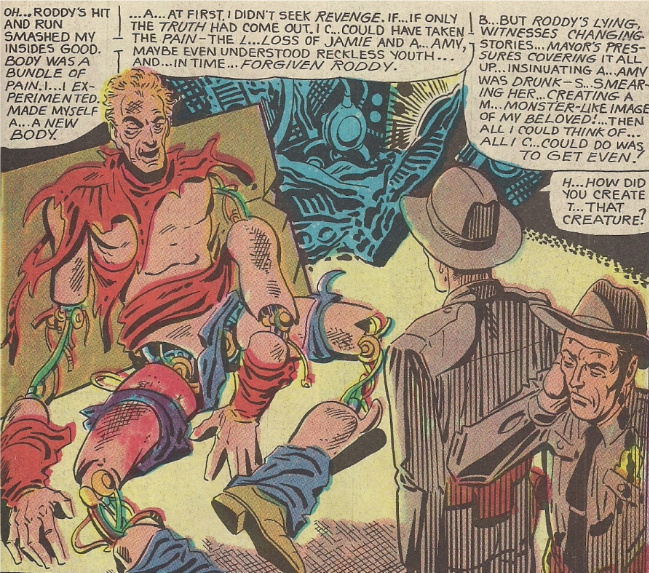 Still, my favorite thing in the issue is Pet Monster, a fusion of Ditko’s pre-Code informed suspense/horror approach with the same idea of Justice as present in the rest of the comic. Above is a memorably grotesque moment, as the mad scientist who unleashed a ravenous creature on the family of the corrupt Mayor who wrecked his life — the politician’s son had killed the scientist’s son and wife in a hit and run incident, and so he ruined the wife’s reputation to place the blame on her — reveals how he tore his own guts out to become a machine. To look at it in an ’80s blood and thunder sense, a post-Watchmen sense, you might think of the scientist as an anti-hero, a flawed man attacking the system in a cruel manner.