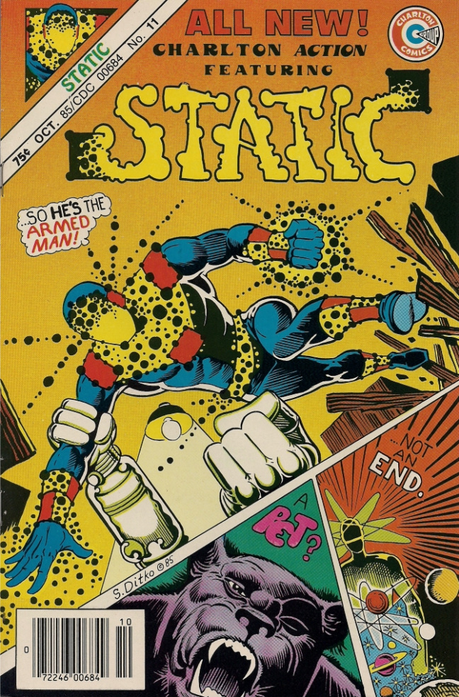 That cover is grand – my own stuck-up-my-own-ass independent interpretation would be “Ditko vs. Kirby – ONLY ONE WILL SURVIVE”, what with Static’s hand, the dots (more carefully patterned, not flowing and willy-nilly like Jack’s), and that weird-tech gun (who would design a gun you could only hold that way? Ditko, that’s who, smart-assed punk!).
