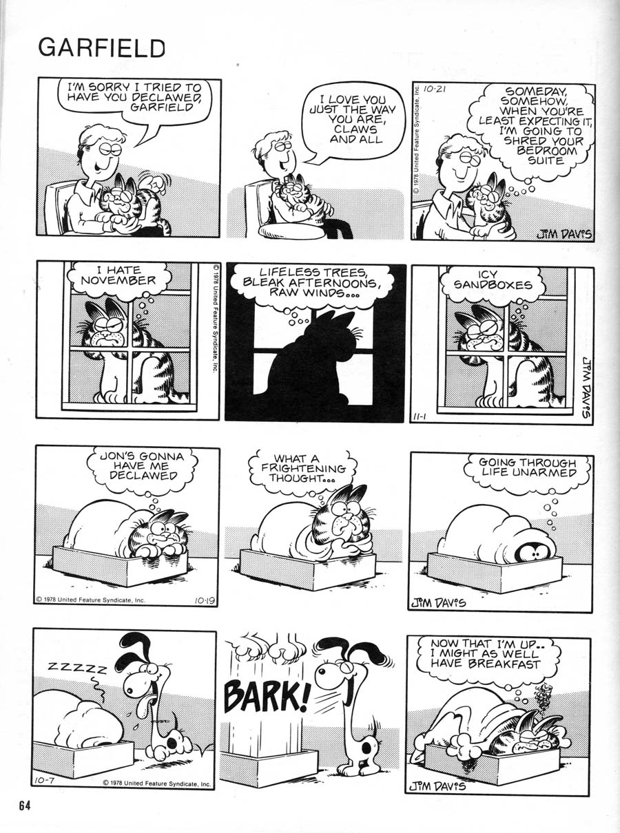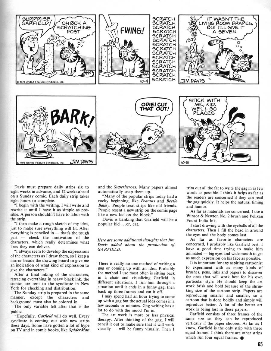 Thumbing through my collection of Cartoonist Profiles looking for tips on Hi-Fi stereo equipment, as I am prone to do, I stumbled over this buff nug from issue #40, 1978: An early (the earliest?) story on Jim Davis and “Garfield”. I audibly exclaimed, thanked my Johnny Harts and put down my Frank Robbins and ran to the scanner. Here, kind people, is an early testament.