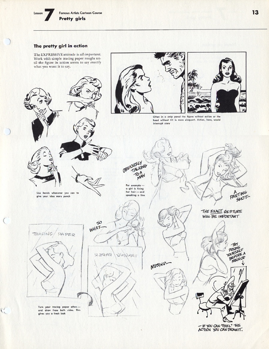 The sexy female figure may be divided into four central parts. First comes the head and hair. A pretty face must be crowned with appropriate hair. … Women readers especially are critical of the way a cartoonist draws the hair on any female characters. Second comes the breasts. It is here that beginners and sometimes even professionals go off the beam by over-exaggeration. The width of a single pen or brush line can make the difference between a pleasing shape and a vulgar or crude lump of fat. Don’t lay sex on with a trowel. Be subtle about it. True, the breasts are drawn larger and a little higher than in real life, but how much larger and higher depends upon the over-all style of the individual cartoonist. Third are the hips. Exaggeration is needed here, too, but again one must not overdo it. Fourth and finally come the legs. The sexy gal must have long shapely legs. A short, dumpy figure has not much appeal and should be avoided.